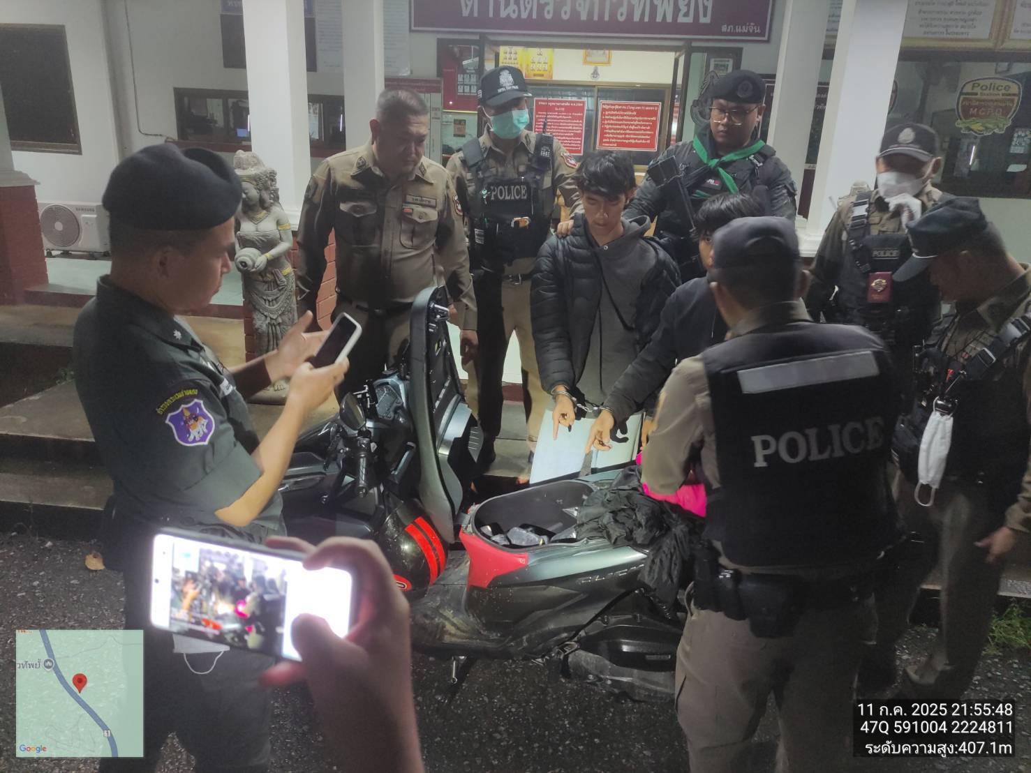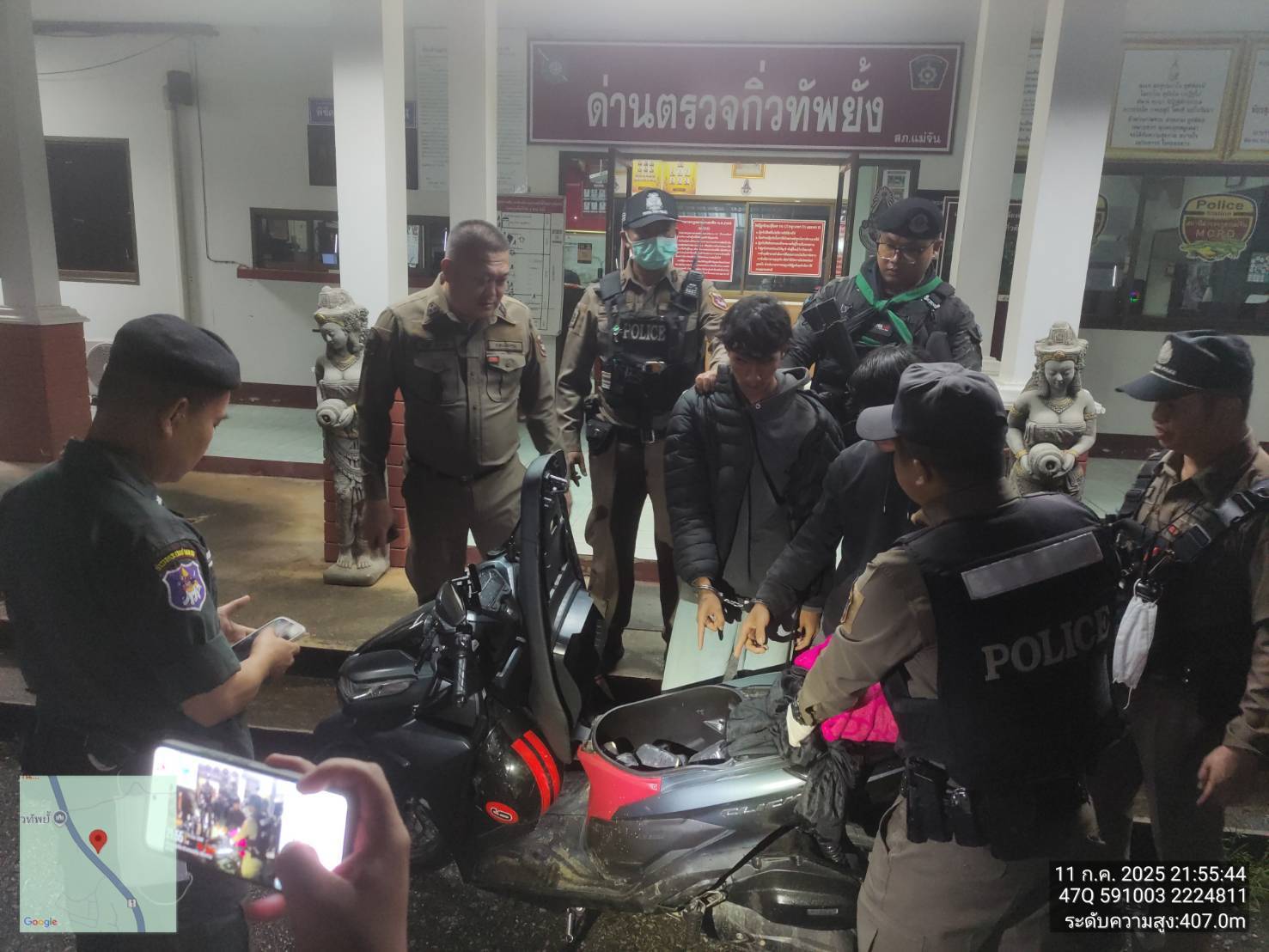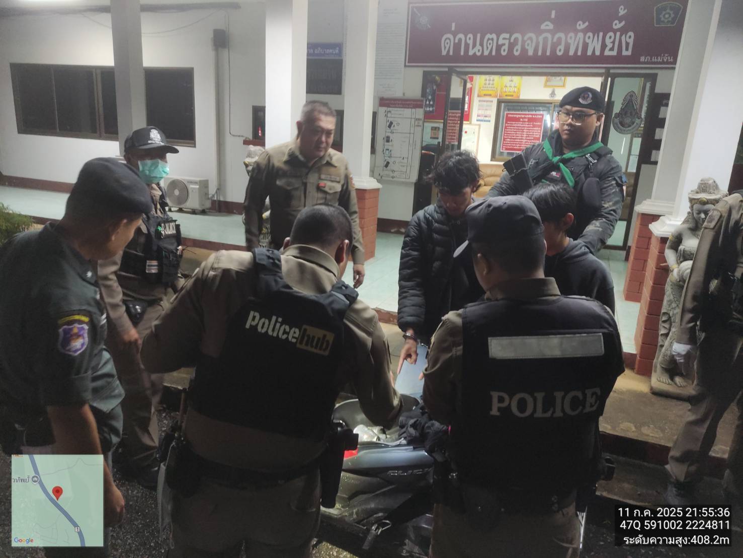 หลังจากเวลาประมาณ 21.30 คืนวันที่ 11 ก.ค.ที่ผ่านมา ร.ต.อ.สวัสดิ์ อ่อนนวล รอง สวป.นำกำลังเจ้าหน้าที่ตำรวจประจุดด่านตรวจกิ่วทัพยั้ง ต.แม่จัน อ.แม่จัน ร่วมกับ ร้อย ตชด.327 และทหารกองกำลังผาเมือง ตรวจตรารถที่สัญจรผ่านไปมาบนถนนพหลโยธิน ได้ตรวจพบรถจักรยานยนต์ยี่ห้อ ฮอนด้า สีดำ หมายเลขทะเบียน จ.เชียงใหม่ ขับขี่มาจาก อ.แแม่จัน มุ่งหน้าจะไปทาง อ.เมืองเชียงราย เมื่อเรียกตรวจสอบพบมีนายสมบูรณ์เป็นผู้ขับขี่และมีนายไก่นั่งโดยสารมาด้วย เมื่อขอตรวจค้นรถปรากฎวาที่ใตเบาะรถซุกซ่อนยาเสพติดประเภทยาบ้าเอาไว้จำนวนประมาณ 22,000 เม็ด เจ้าหน้าที่จึงควบคุมตัวทั้งคู่เอาไว้และนำตัวไปตรวจหาสารเสพติดในปัสสาวะแต่เบื้องต้นไม่พบสารเสพติด