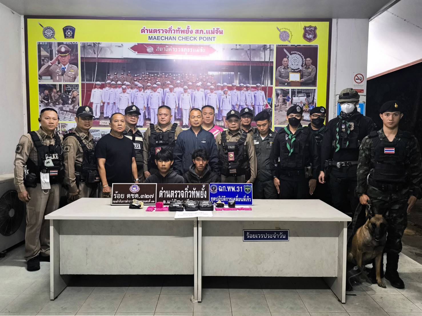 สวป.,พ.ต.ต.ศักดิ์ชาย รีอินทร์ สวป.(ชส.) มอบหมายให้เจ้าหน้าที่ควบคุมตัวนายสมบูรณ์ อายุ 19 ปี ชาว ต.เวียงพางคำ อ.แม่สาย จ.เชียงราย และนายไก่ (นามสมมุติ) อายุ 16 ปี ชาว ต.โป่งงาม อ.แม่สาย พร้อมของกลางยาเสพติดเพื่อดำเนินคดีตามกฎหมาย